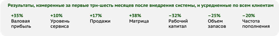 По оценке компании Deloitte и по итогам наших проектов, применяемый финансово-экономический подход показал самую высокую эффективность и Inventor Soft бросила вызов всем передовым международным SCM-решениям по управлению запасами, см.акцию «ВЫЗОВ!» на сайте. И теперь любая компания, может обратиться за бесплатным анализом существующей системы управления запасами «как есть» и получить оценку своих резервов эффективности в управлении своими запасами «как будет».
